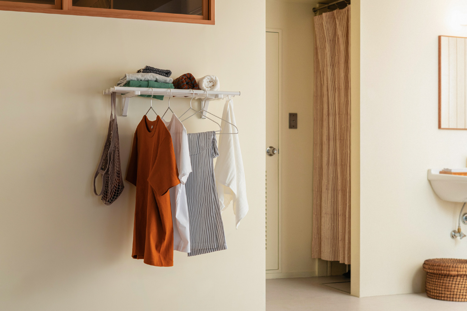 手前のポールにはハンガーを、上には畳んだ衣類などを置いて小さなクローゼットのように使用できます。